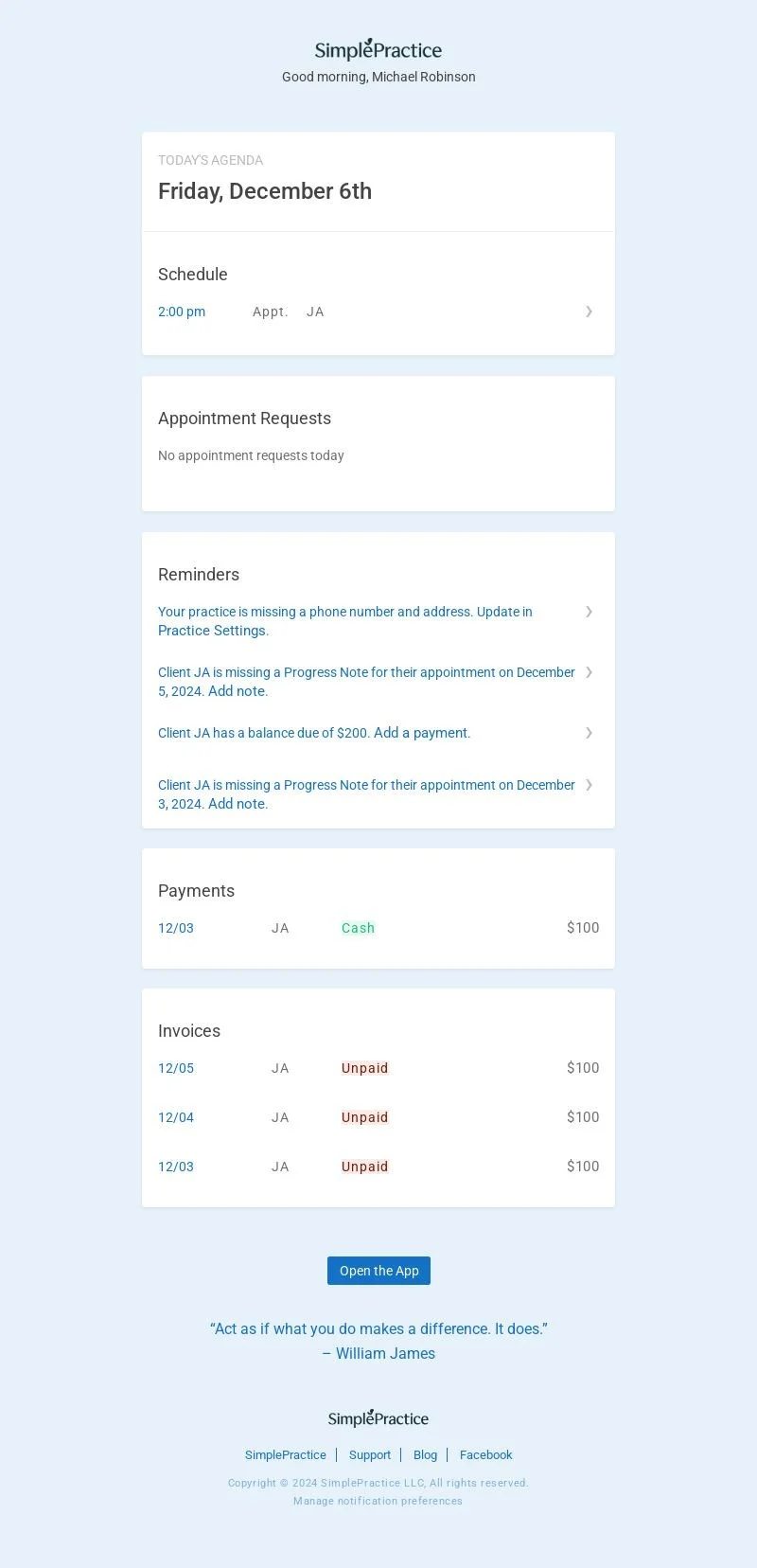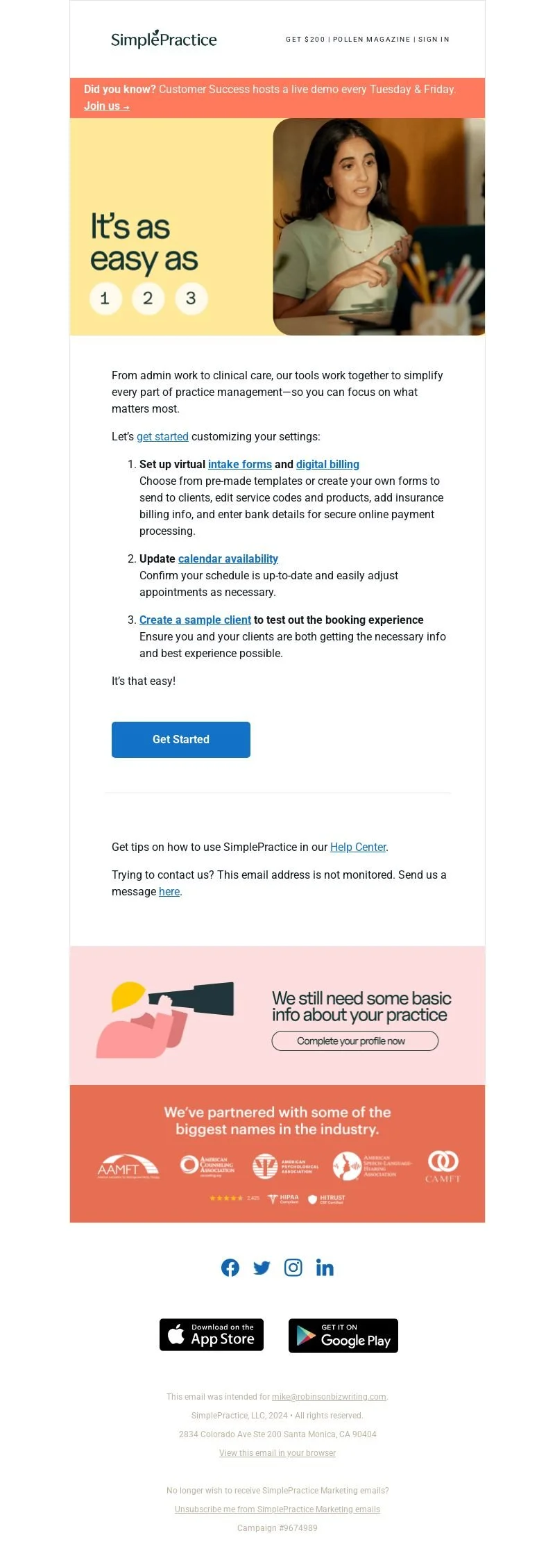 The subject lines are straightforward and descriptive of the actual content of the emails. This is great for SaaS emails, especially in the B2B space … go for clarity over creativity or quirkiness. However, putting them in sentence case instead of title case would help establish the conversational tone Simple Practice should be going for.