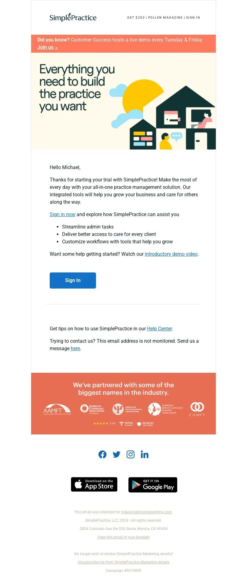 Although there are likely too many emails in total, at least Simple Practice is not under-engaging the trial subscriber, which is a common problem with onboarding series.